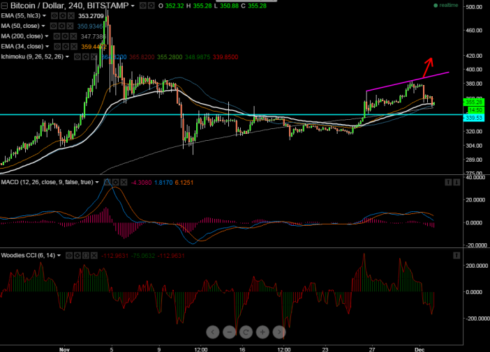 BTC/USD has broken minor trend line support $365 and declined till $348 and it is currently trading at $353.