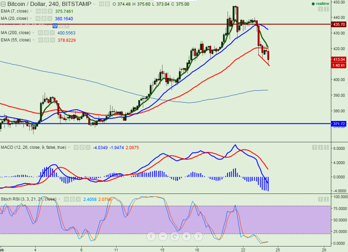 BTC/USD breaks minor support and declined till $409 at the time of writing. It is currently trading around $412.