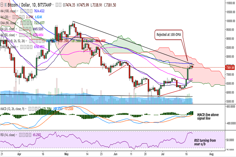 BTC/USD is trading in the red on Friday after it got rejected at 100-DMA resistance. It is currently trading at 7371 levels at the time of writing (Bitstamp).