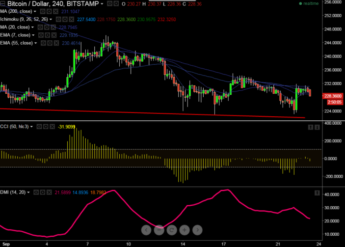 - BTC/USD is facing strong support around $220 and any further weakness only below $220 level. It is currently trading at $224.95. Short term trend is weak as long as resistance $235 holds.
