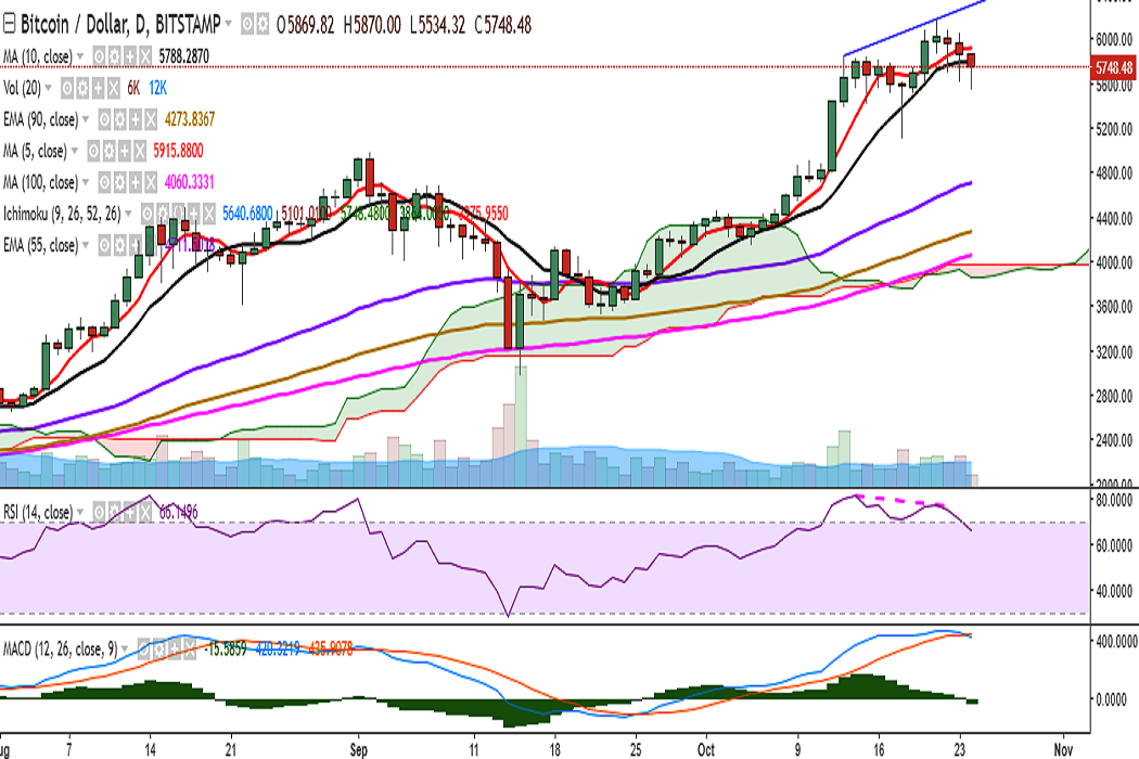 On the flipside, support is seen at 5492 (4h 90-EMA) and any violation would drag the pair to 5422 (23.6% retracement of 2972.01 and 6180)/5339 (20-DMA). Further weakness would target 5270 (1w 5-SMA)/5101 (October 18 low).