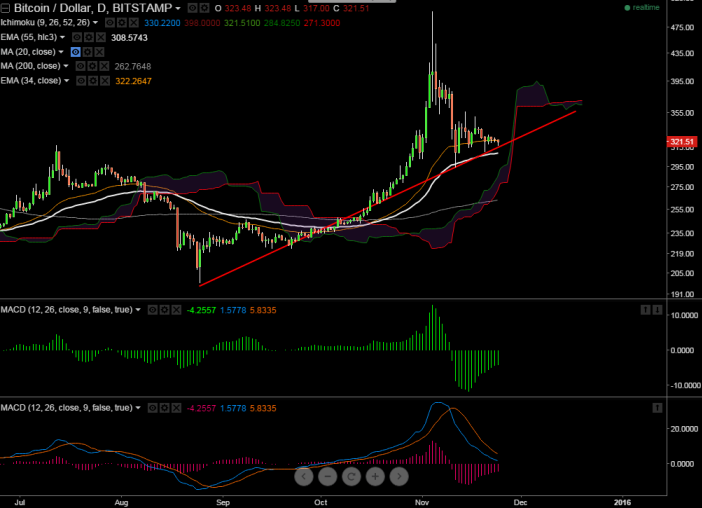- BTC/USD has broken minor support $325 and declined till $310. It is currently trading around $321.