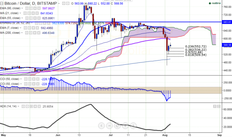 BTC/USD has jumped till $580 at the time of writing after making a low of $465 (Aug 2 low), the plunge being attributed to the recent Bitfinex security breach. It is currently trading at $569 (Bitstamp).