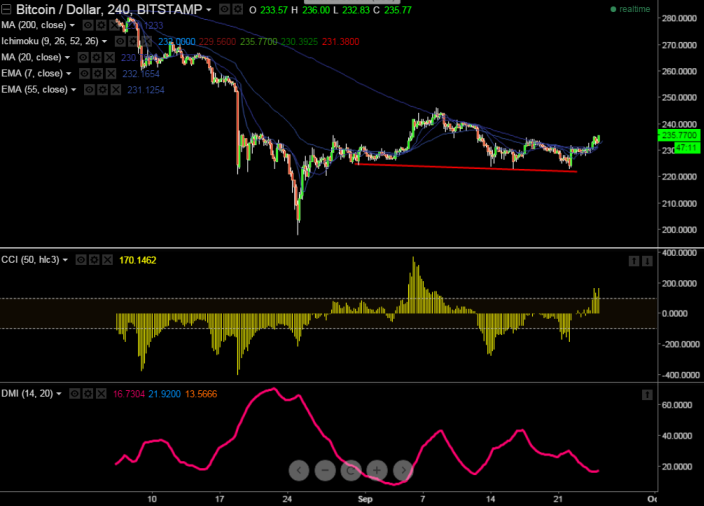 BTC/USD is facing strong support around $220 and any further weakness only below $220 level. It is currently trading at $224.95. Short term trend is weak as long as resistance $235 holds.