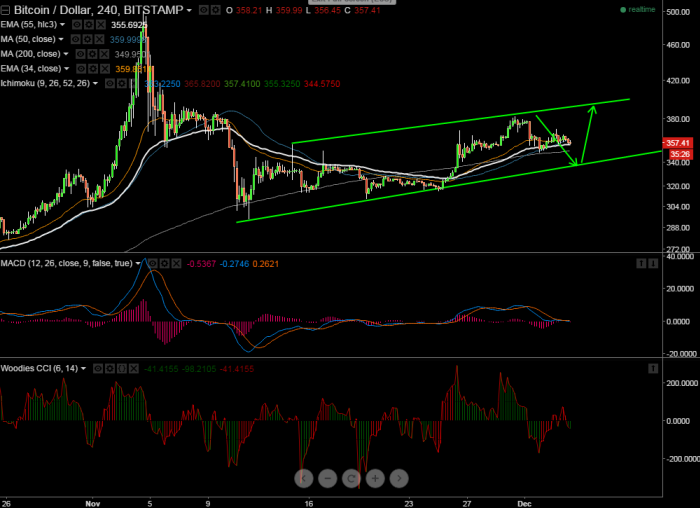 BTC/USD has made a high of $371 and started to decline from that level. It is currently trading around $356. Short term trend is bullish as long as trend line support $335 holds.