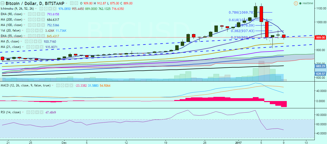 BTC/USD plummeted to 812.28 levels (December 07) following the People’s Bank of China’s notice to bitcoin exchanges to ensure regulatory compliance. It is currently trading at 886 levels (Bitstamp).