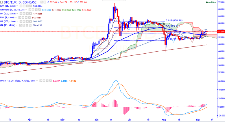 BTC/EUR is seen trading below in red on Friday. The pair has slightly retreated after making a high of 562.30 levels (COINBASE). It is currently trading around 552 at the time of writing.