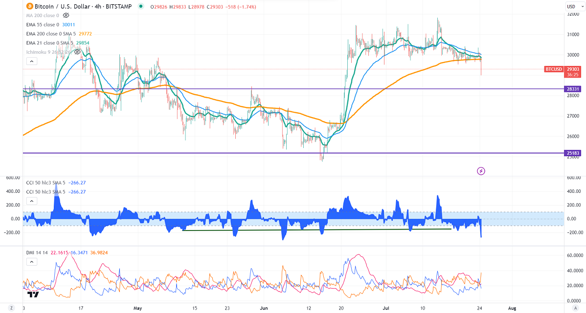 BTCUSD lost its shine on Alphapo's hot wallet hack. It was hacked for over $ 31 million in Ethereum, Tron, and Bitcoin. Markets eye US Fed monetary policy for further direction.BTC hits a low of $28978 and currently trading around $29311.