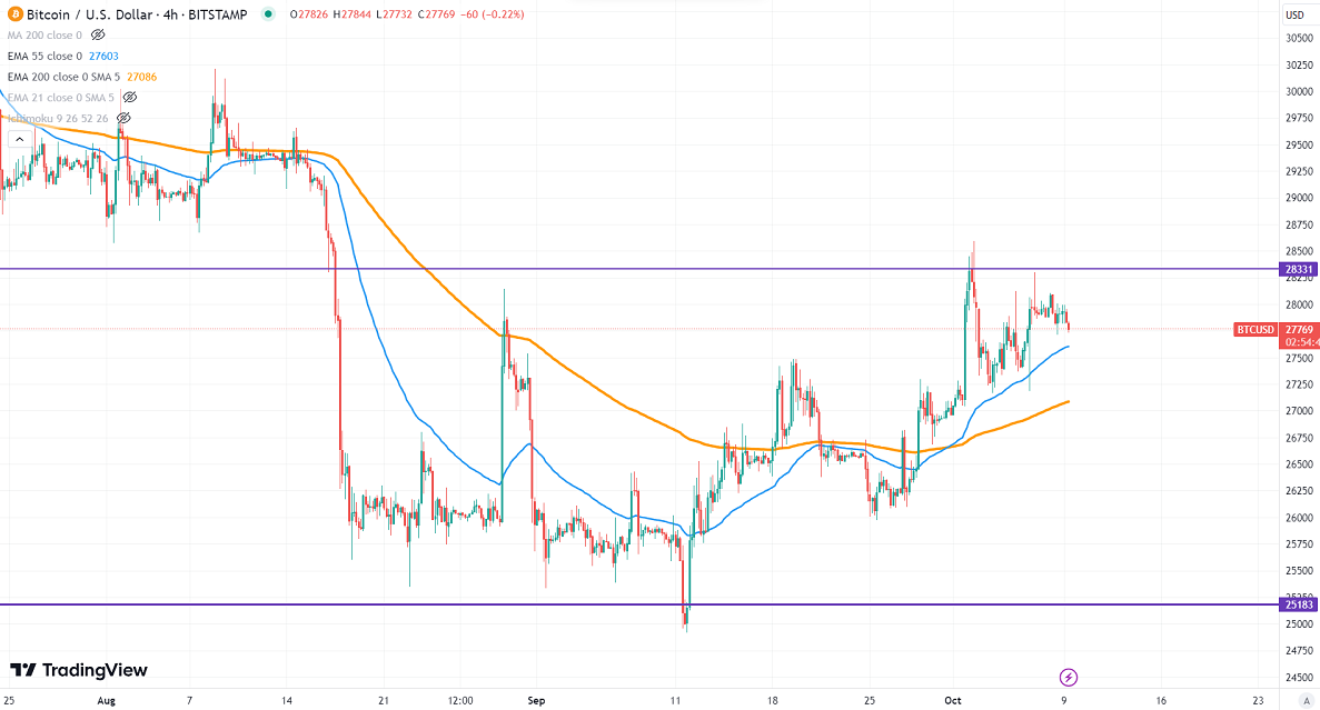 BTCUSD has traded in a narrow range between $28617 and $27160 for the past week. It hit a high of $28288 yesterday and is currently trading around $27752.