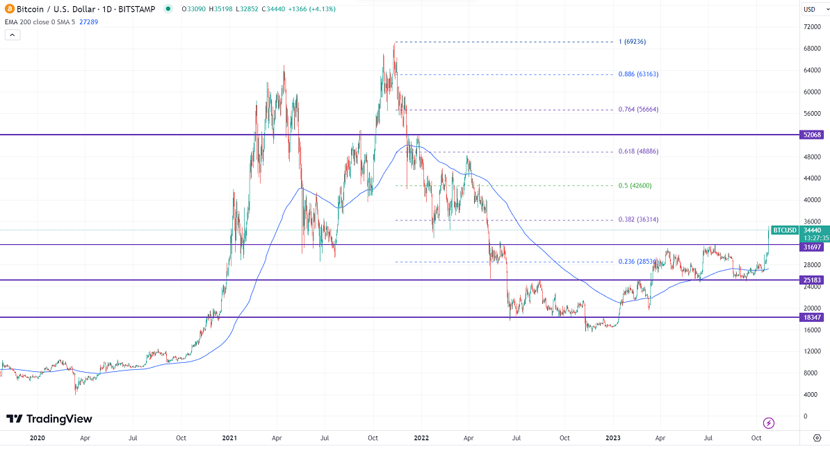 BTCUSD showed a massive rally of more than $8000 in the past two weeks. It hit a high of $35198 yesterday and is currently trading around $34294.