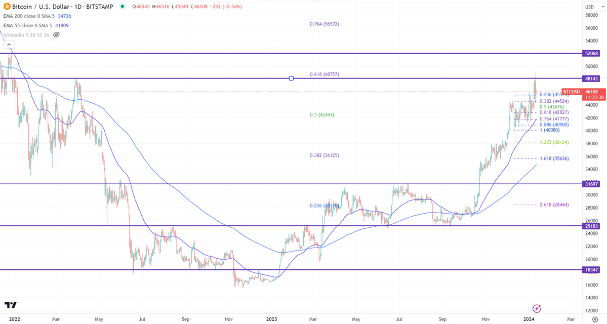 BTCUSD hits $49048, the highest level since Dec 2021 after SEC BTC ETF approval. It hit a low of $45546 at the time of writing and is currently trading around $45979.