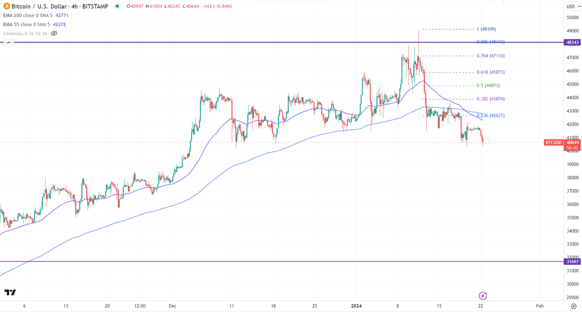 BTCUSD prices pared some of its gains on board-based US dollar buying. It hit a low of $40345 and is currently trading around $40604.