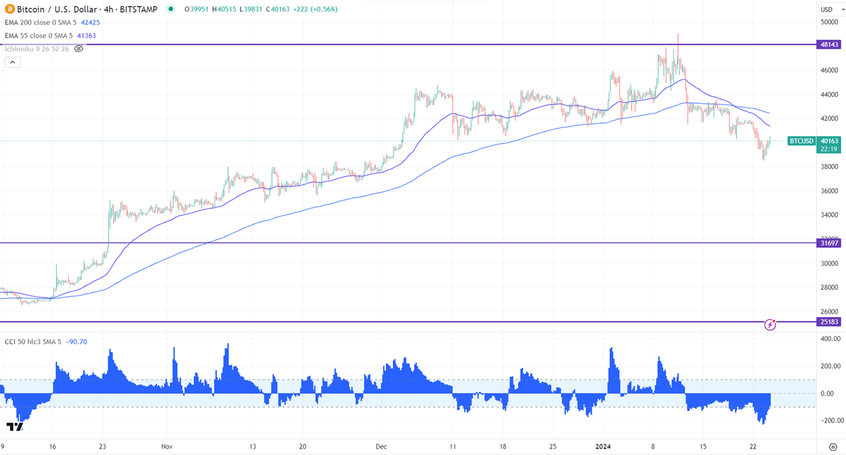 BTCUSD prices gained slightly due to short covering. It hit a low of $38505 and is currently trading around $ 40198.