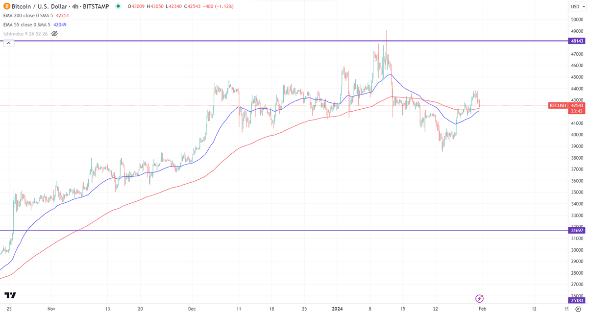 BTCUSD prices pared some of its gains ahead of US FOMC monetary policy. Any hawkish comments from the Fed will drag the BTC prices down. It hit a low of $42340 and is currently trading around $ 42437.