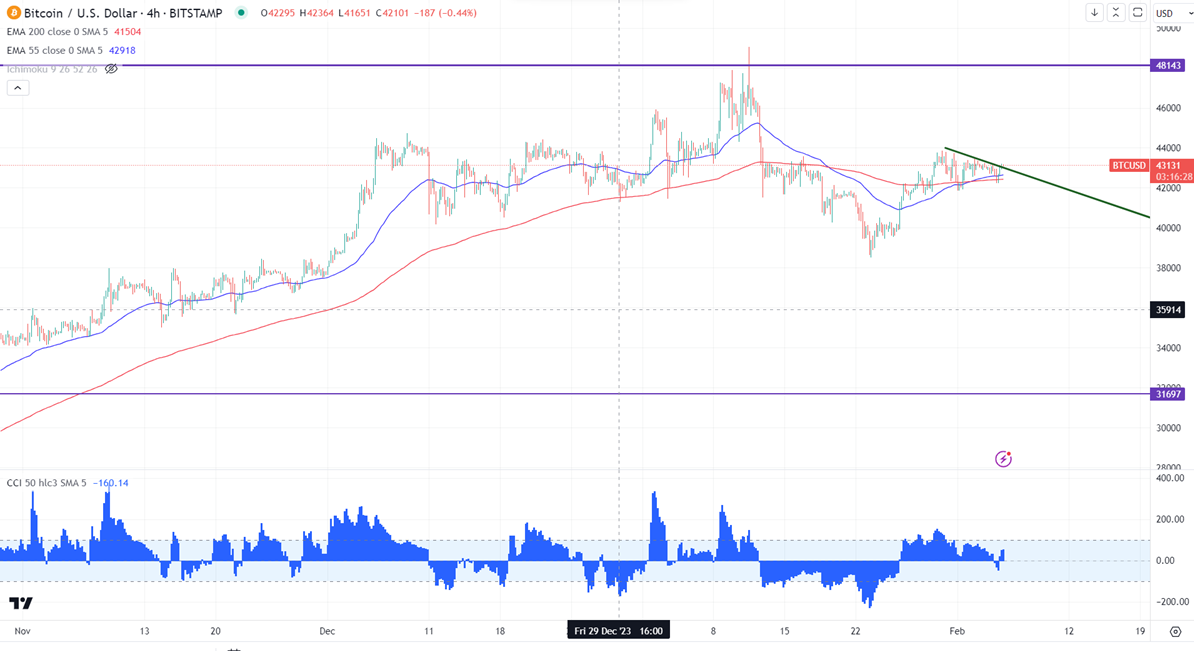 BTCUSD price holds above $43000 despite upbeat US non-farm payroll data. The US economy added 353000 jobs in Jan, well above the forecast of 180000. Unemployment came in line with expectations of 3.70%. Wage inflation surged to 4.5% vs. Estimate of 4.1%. for the past three days. It hit a high of $43209 at the time of writing and is currently trading around $ 43158.