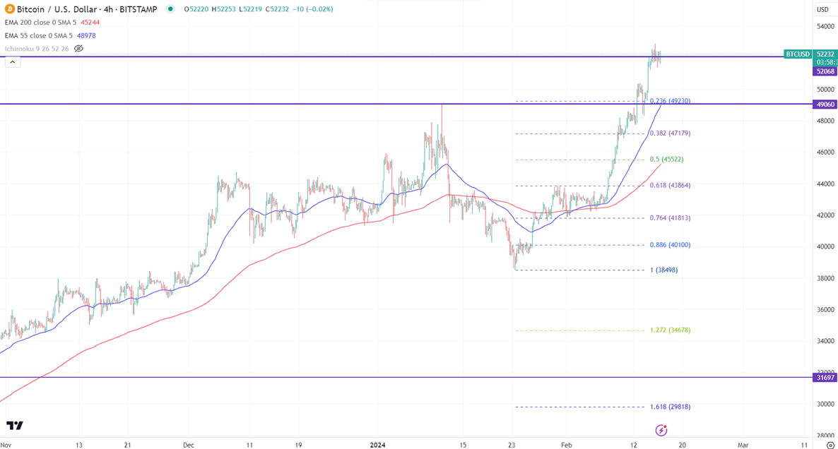 BTCUSD is consolidating after a massive rally of more than $14000.It hit a high of $52890 and is currently trading around $52327.