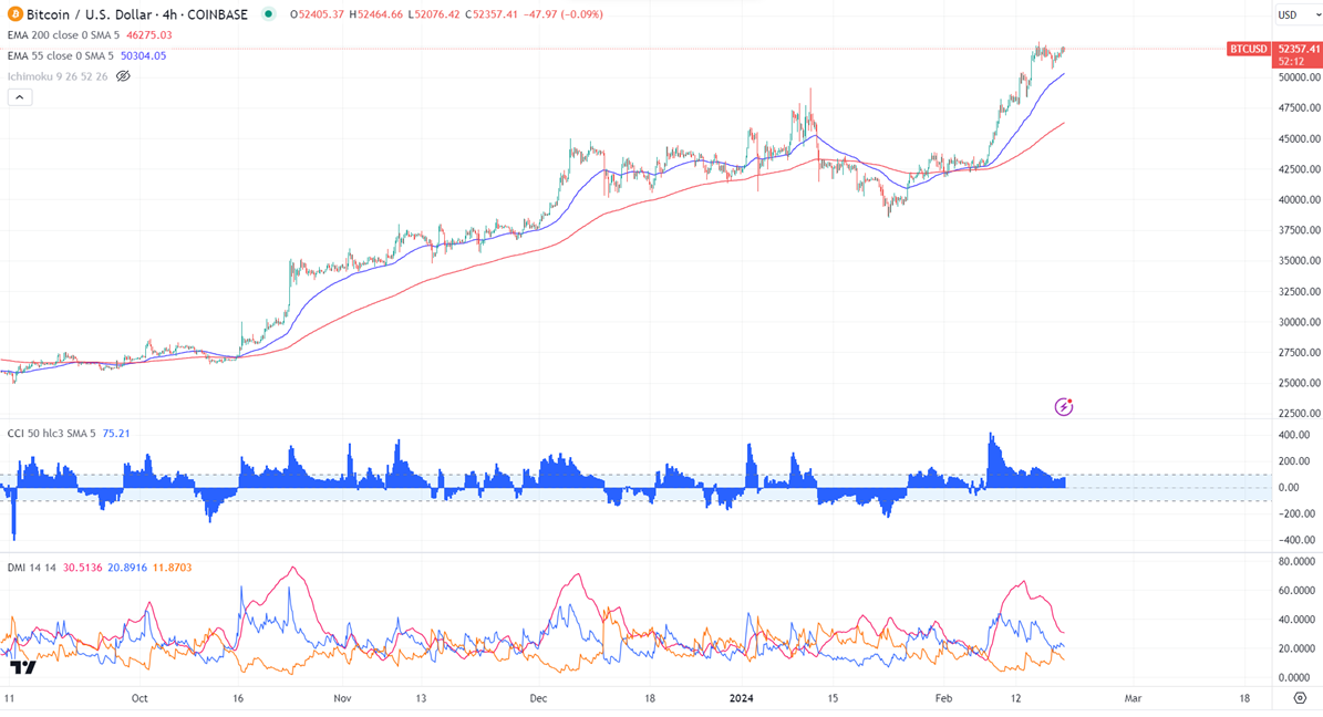 BTCUSD has been consolidating in a narrow range between $52890 and $50642 for the past four days. It hit a high of $52501 at the time of writing and is currently trading around $52392.
