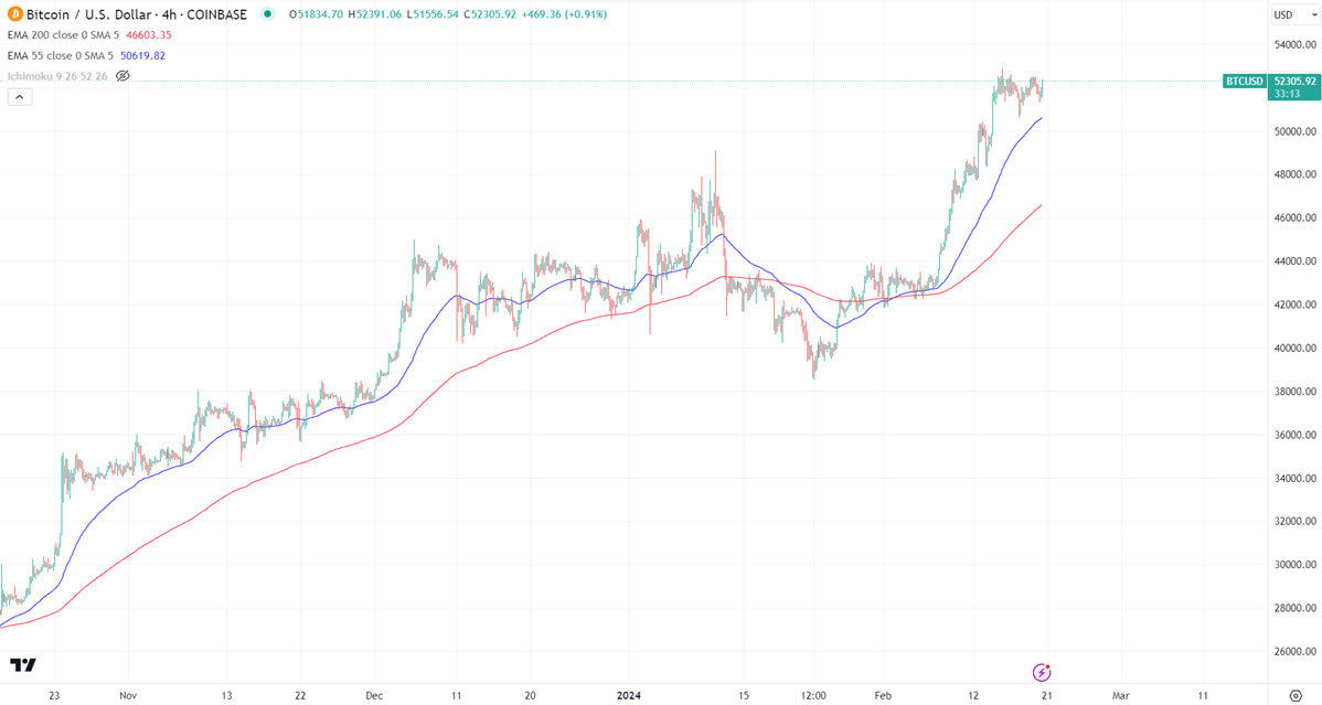 BTCUSD is trading flat as the US market shut yesterday on account of Washington's birthday. It hit a high of $52075 at the time of writing and is currently trading around $52062.