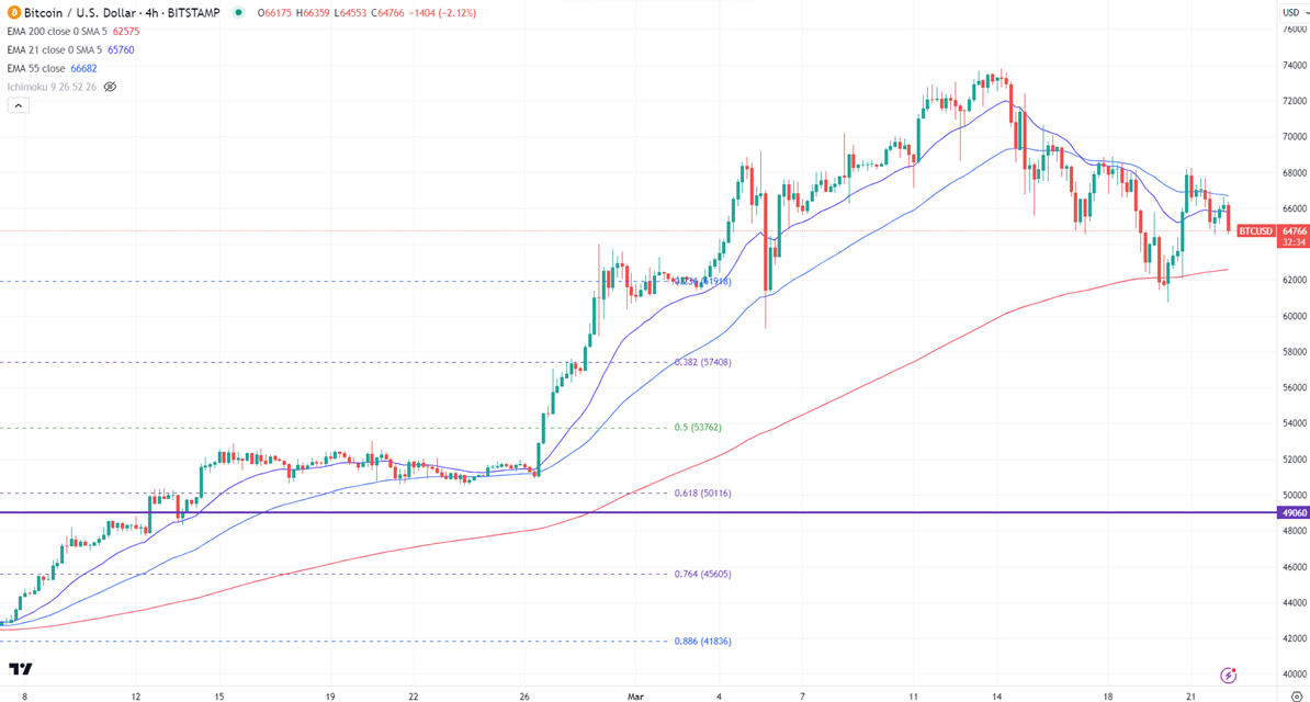 BTCUSD pared some of its gains made after the US fed monetary policy. It hit a low of and is currently trading around $64843.