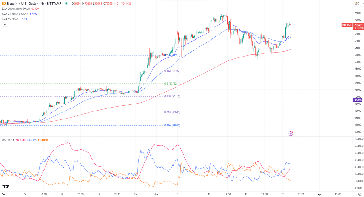 BTCUSD recovered sharply on upbeat market sentiment. It hit a high of $715975 and is currently trading around $70607.
