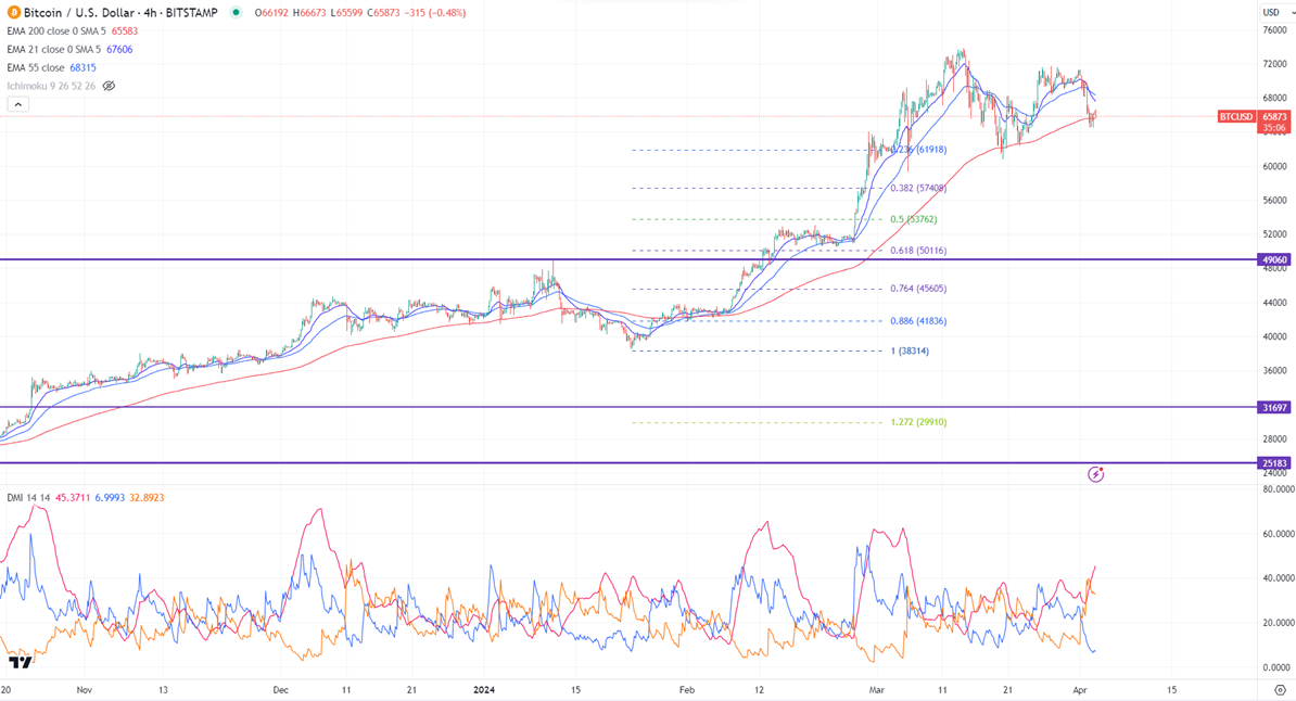 BTCUSD trades below the short-term moving average (21 and 55 EMA) and above the long-term moving average (200 EMA) in the 4-hour chart.