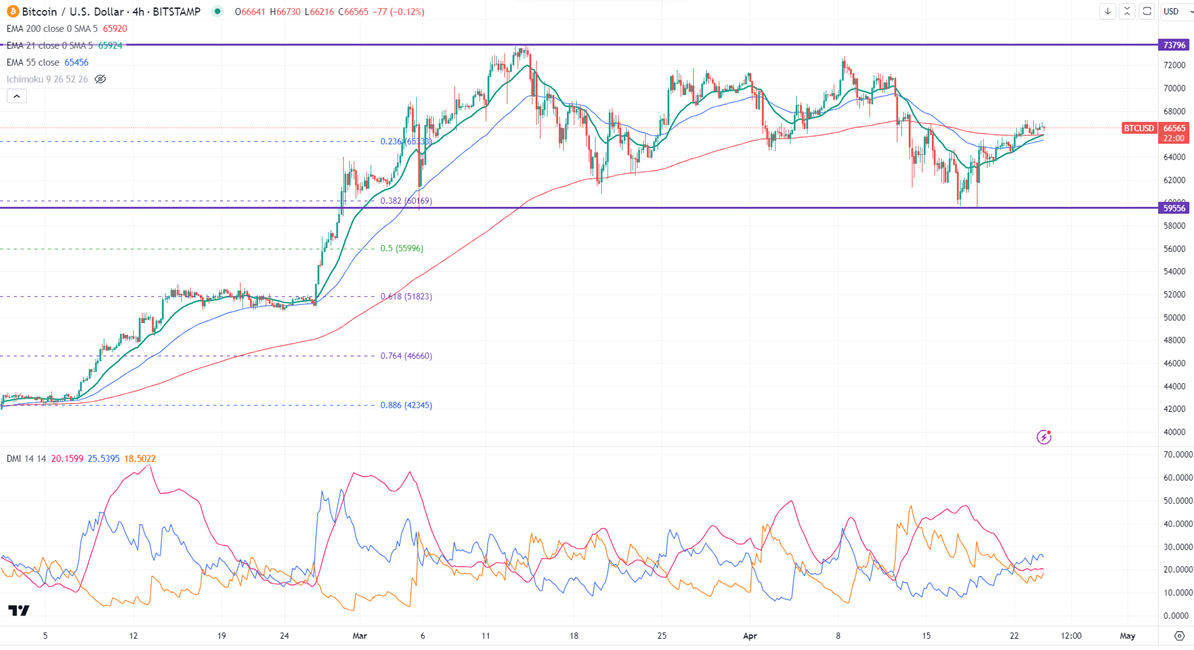 BTCUSD trades above the short-term moving average (21 and 55 EMA) and the long-term moving average (200 EMA) in the 4-hour chart.