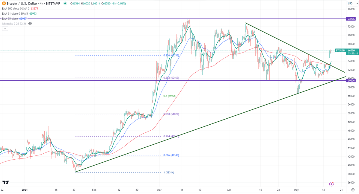 BTCUSD surged sharply after weak US inflation data. It hit a high of $66688 at the time of writing and is currently trading around $66287.