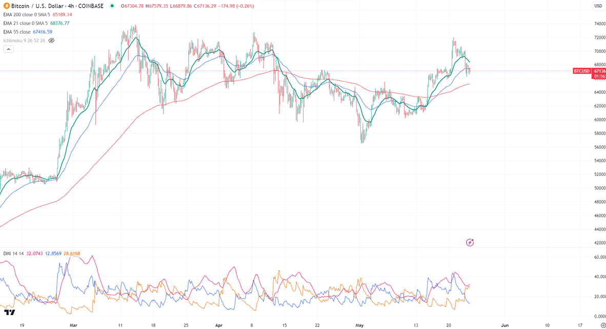 BTCUSD trades above the short-term moving average (21 and 55 EMA) and the long-term moving average (200 EMA) in the 4-hour chart.