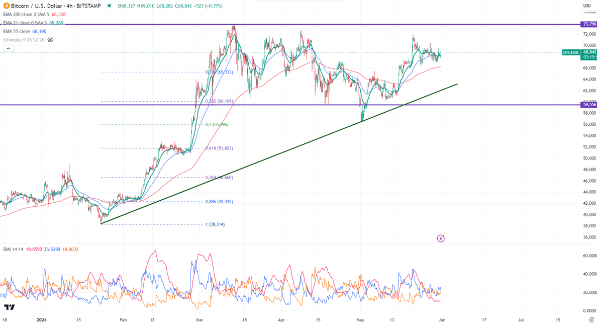 BTCUSD trades above the short-term moving average (21 and 55 EMA) and the long-term moving average (200 EMA) in the 4-hour chart.