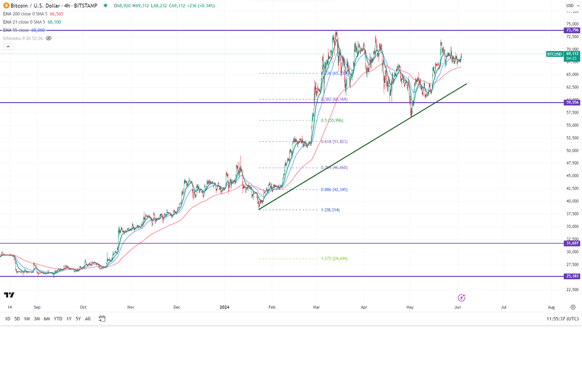 BTCUSD showed a minor pullback on soft US inflation. It hit a high of $69312 yesterday and is currently trading around $69050.