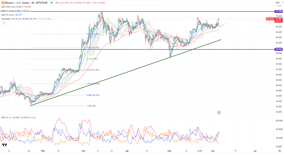 BTCUSD inches towards all-time high on upbeat market sentiment. It hit a high of $71339 at the time of writing and is currently trading around $70903.