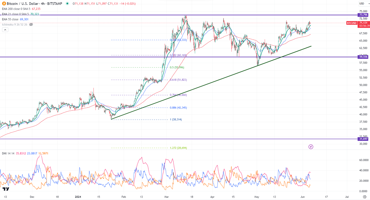 BTCUSD is consolidating in a narrow range after a massive buying. It hit a high of $71759 at the time of writing and is currently trading around $71054.