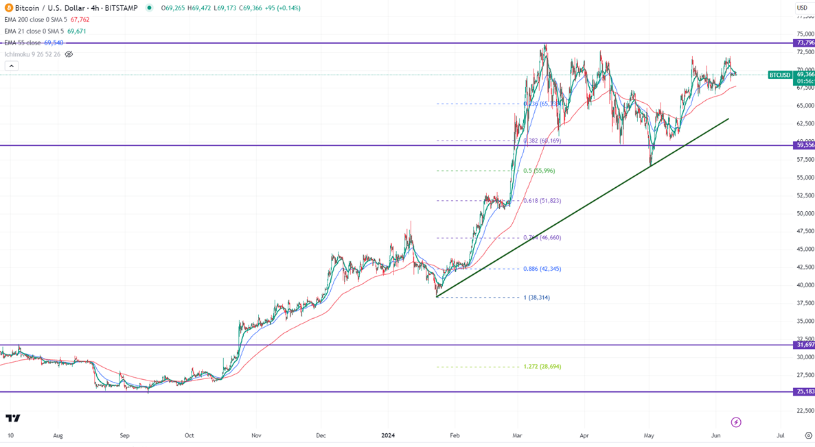 BTCUSD pared some of its gains on strong US jobs data on Friday. It hit a low of $68450 yesterday and is currently trading around $69347.