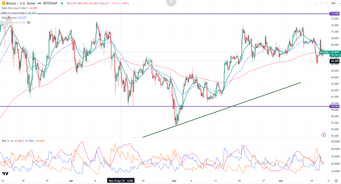 BTCUSD showed a minor sell-off after Fed hawkish rate pause. It hit a low of $66983 yesterday and is currently trading around $67691.