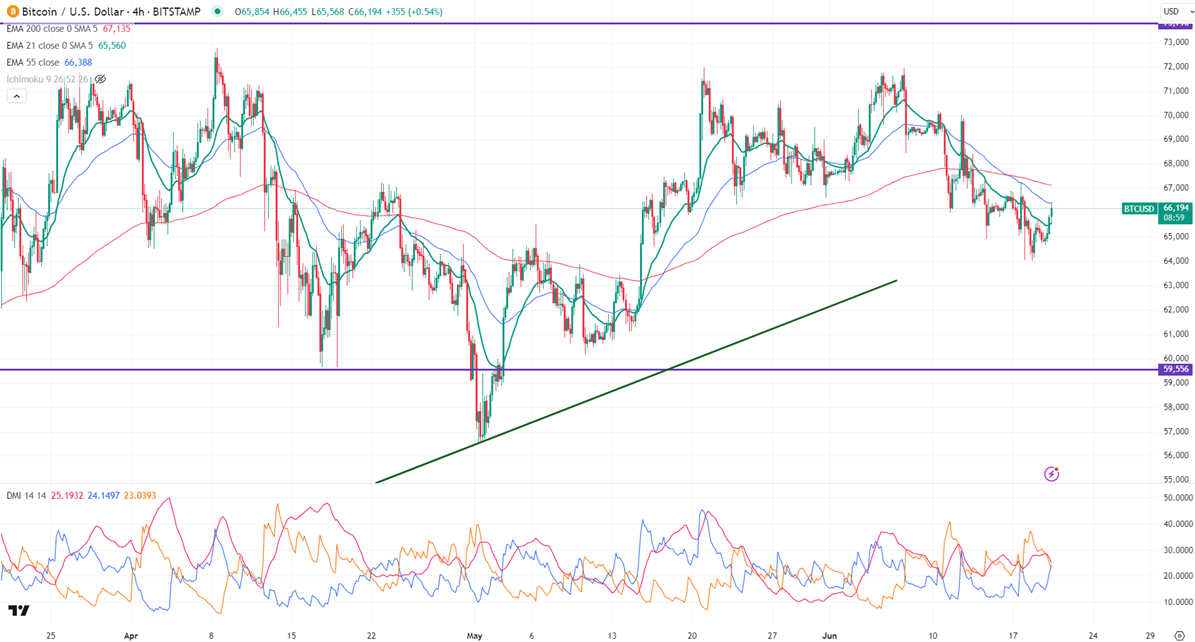 BTCUSD trades below the short-term moving average (21 and 55 EMA) and the long-term moving average (200 EMA) in the 4-hour chart.