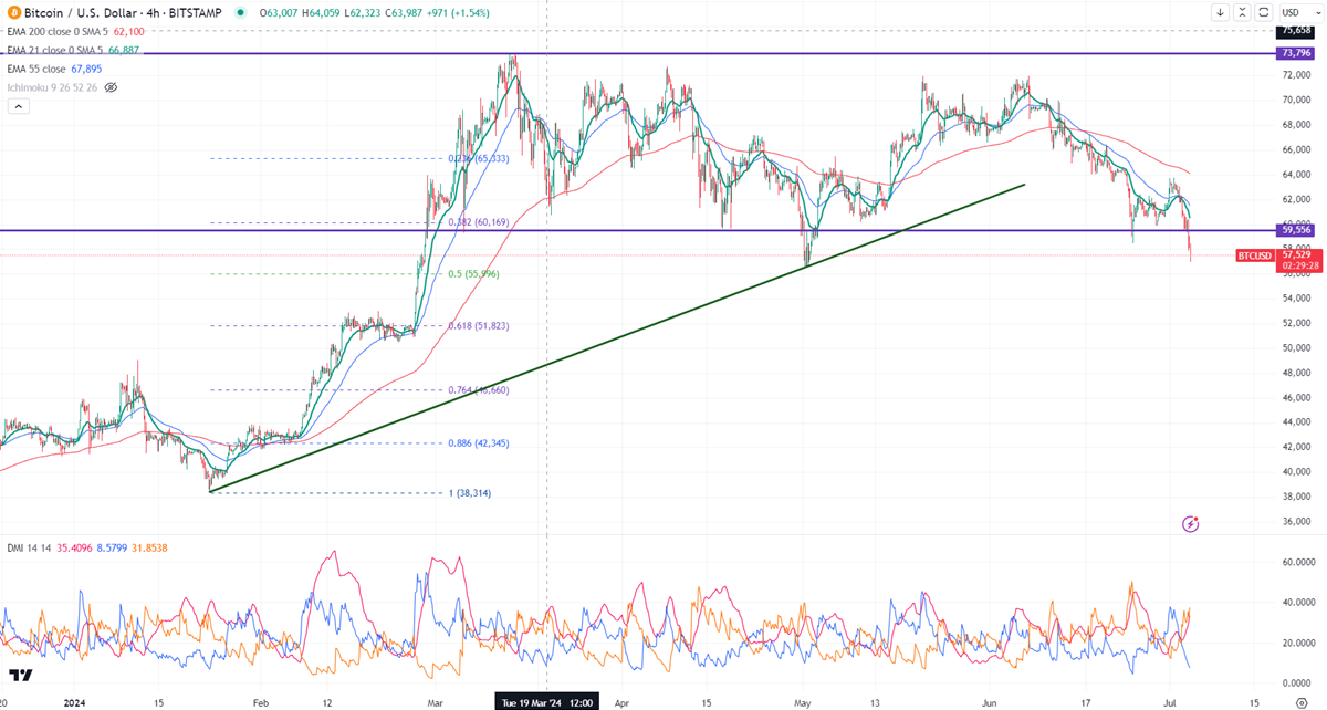 BTCUSD lost its shine and holds well below $60000 as rate cut speculation eases. It hit a low of $56952 and is currently trading around $57342.