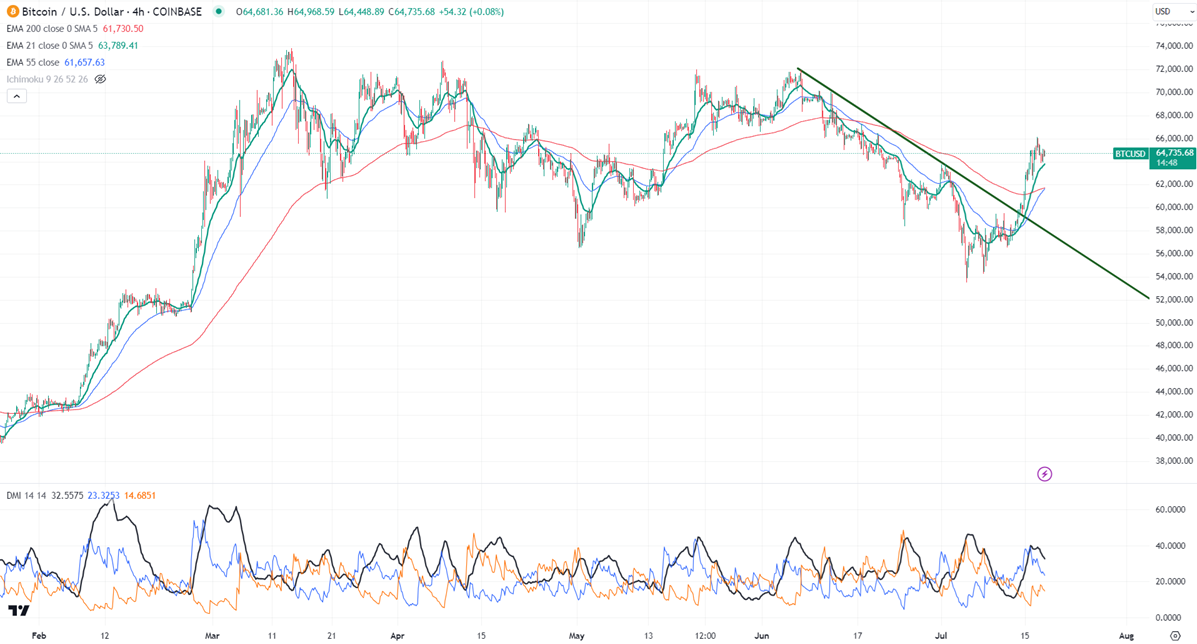 BTCUSD trades above the short-term moving average (21 and 55 EMA) and the long-term moving average (200 EMA) in the 4-hour chart.
