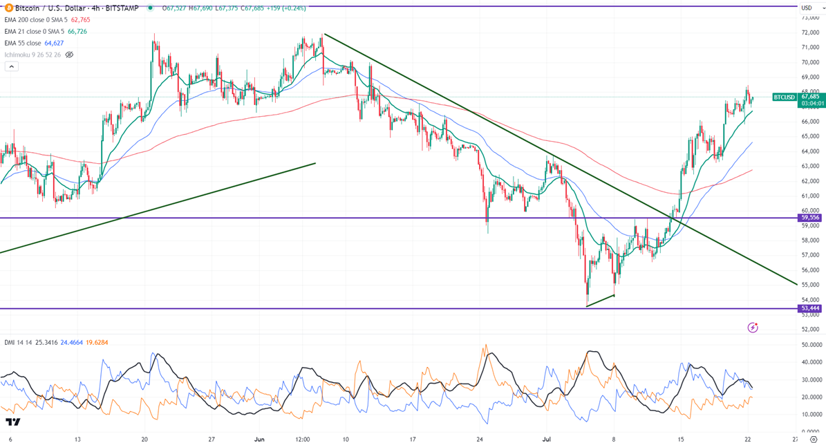 BTCUSD holds above $65000 on upbeat market sentiment. It hit a high of $68486 yesterday and is currently trading at around $67662.