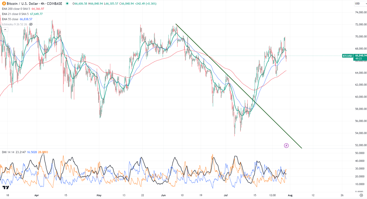 BTCUSD trades above the short-term moving average (21 and 55 EMA) and the long-term moving average (200 EMA) in the 4-hour chart.
