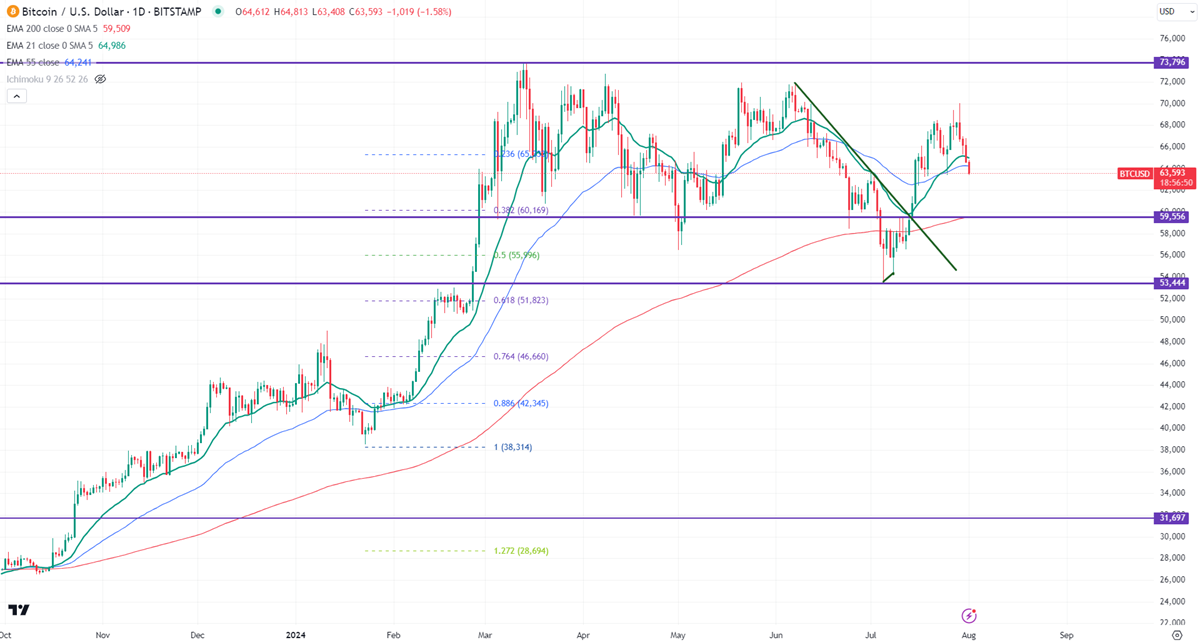 BTCUSD lost its shine after the Fed monetary policy. It hit a low of $63723 yesterday and is currently trading at around $63799.