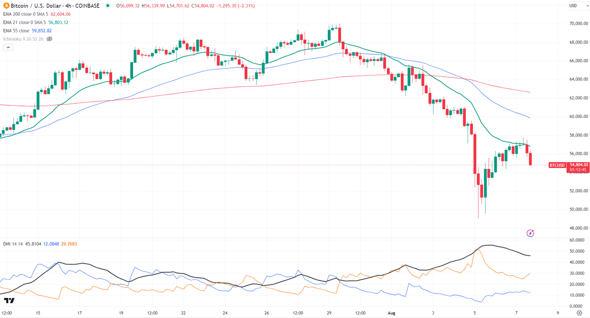 BTCUSD trades below the short-term moving average (21 and 55 EMA) and the long-term moving average (200 EMA) in the 4-hour chart.