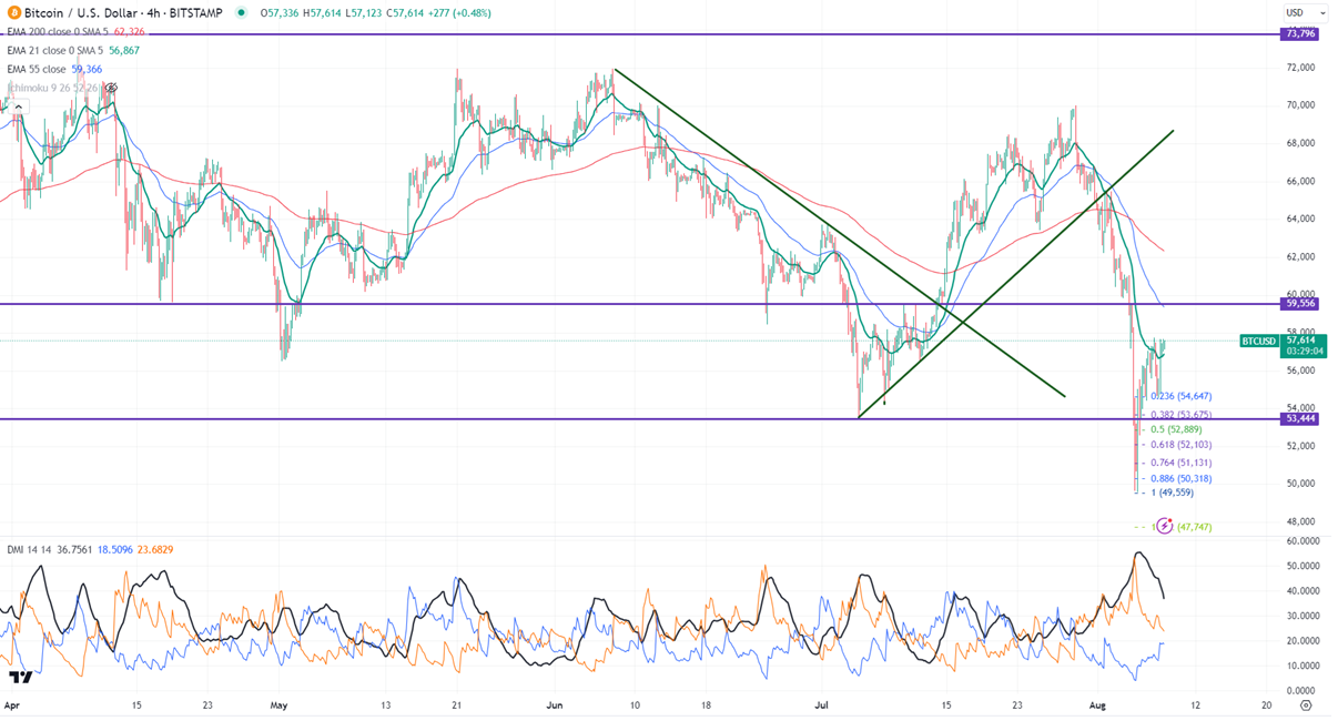BTCUSD trades above the short-term moving average 21 EMA and below 55 EMA and the long-term moving average (200 EMA) in the 4-hour chart.
