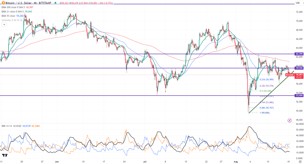BTCUSD showed a minor sell-off after upbeat US retail sales. It hit a low of $57844 and is currently trading at around $58066.