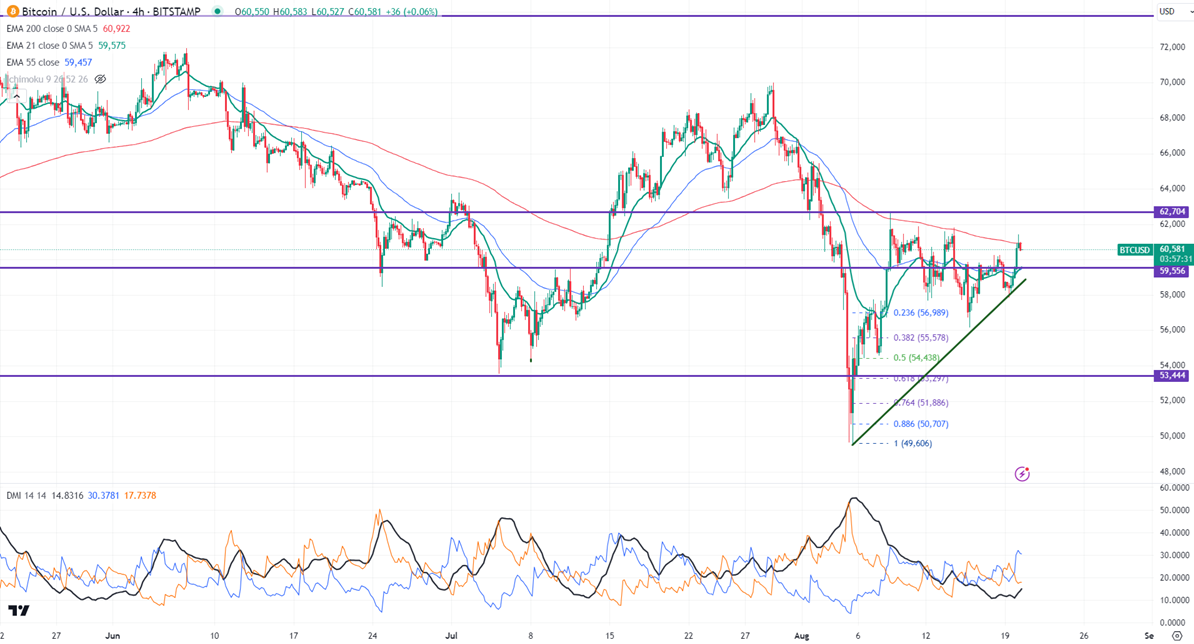 BTCUSD trades above the short-term moving average 21 EMA,55 EMA and the long-term moving average (200 EMA) in the 4-hour chart.