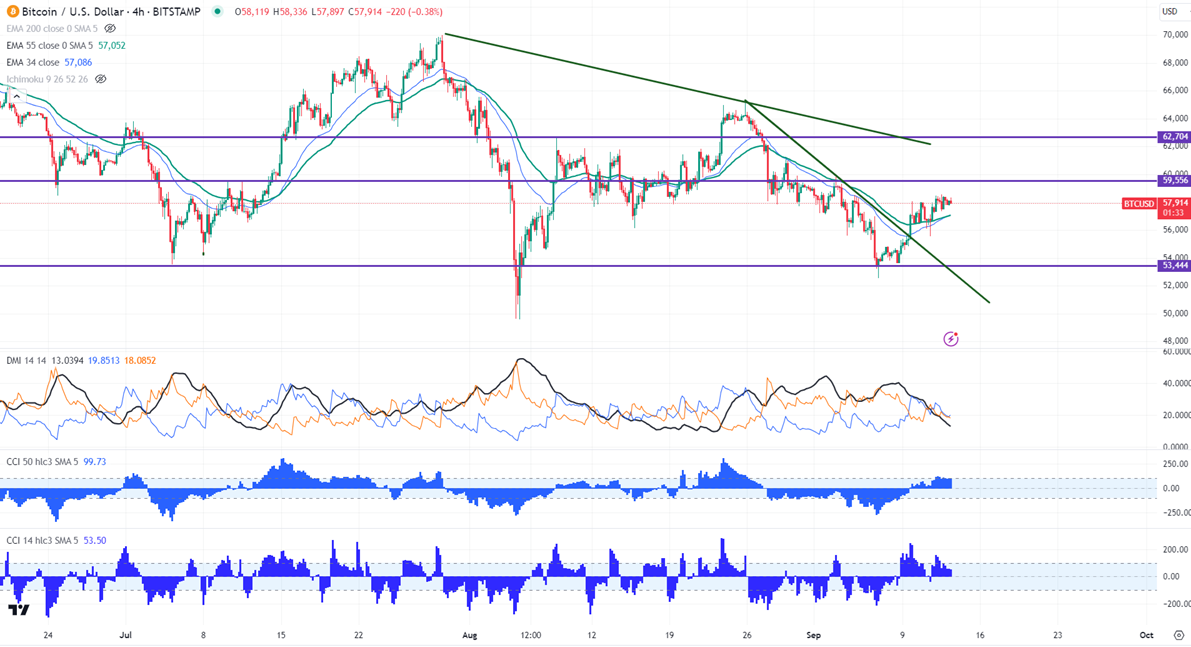 BTCUSD trades above the short-term moving average 34- EMA and 55 EMA and below the long-term moving average (200 EMA) in the 4-hour chart.