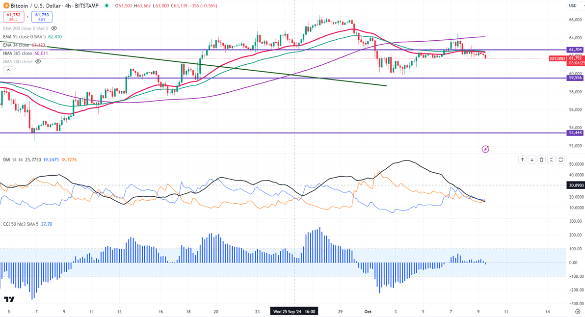 BTCUSD trades weak due to profit booking. It hit a low of $61824 at the time of writing and is currently trading at around $61787.