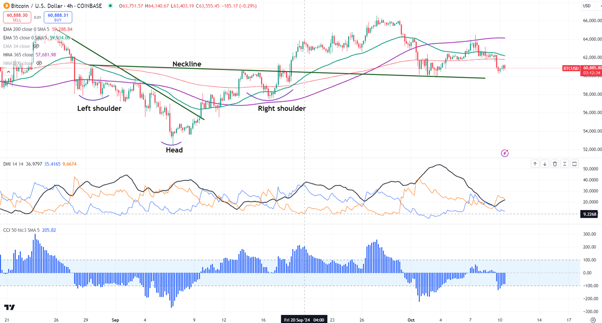BTCUSD trades below the short-term moving average 34- EMA and 55 EMA and the above long-term moving average (200 EMA) in the 4-hour chart.