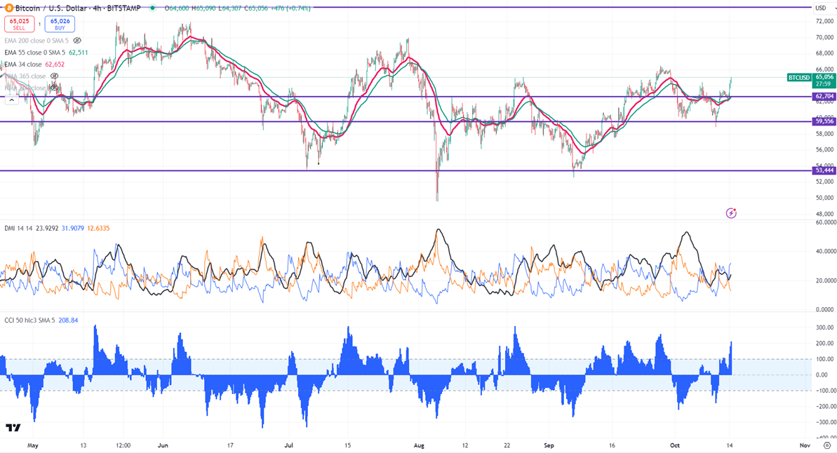 BTCUSD trades higher due to upbeat market sentiment. It hit a high of $64949 at the time of writing and is currently trading at around $64849.
