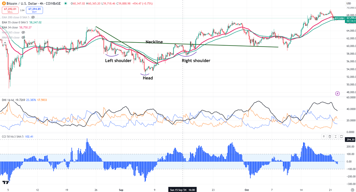 BTCUSD trades above the short-term moving average 34- EMA and 55 EMA and the long-term moving average (200 EMA) in the 4-hour chart.