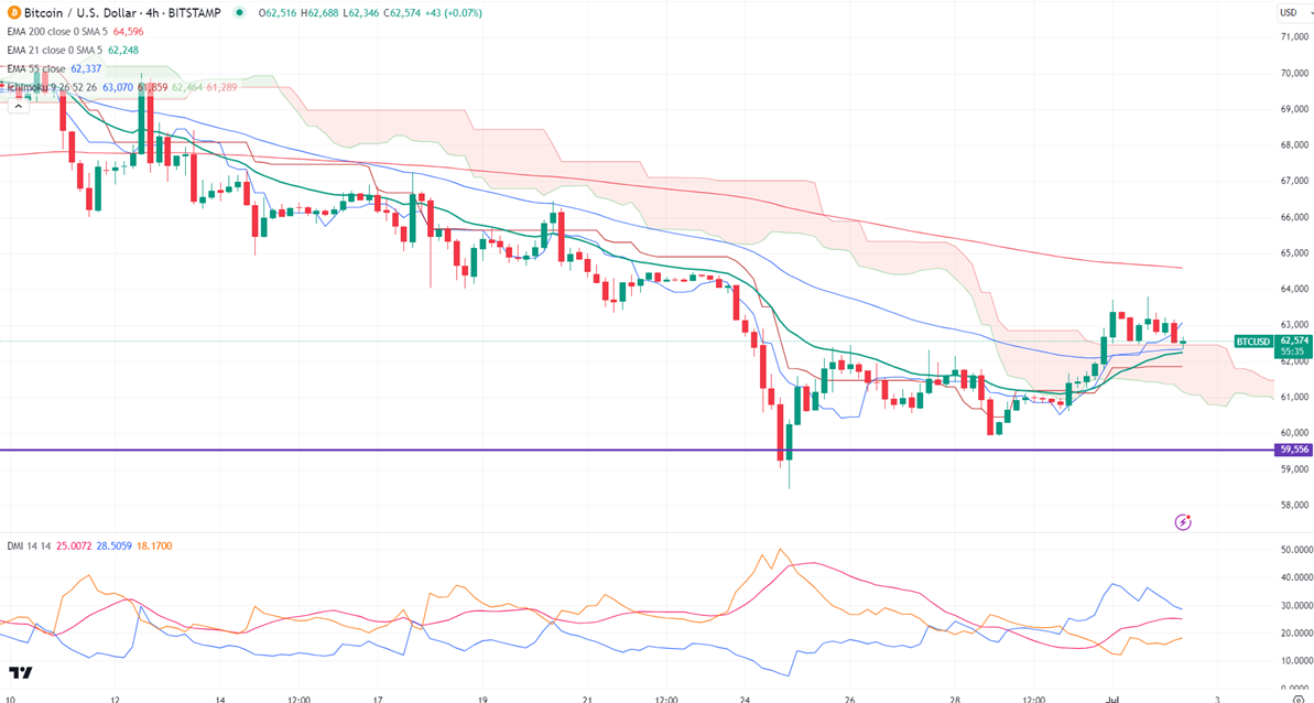 BTCUSD trades above the short-term moving average (21 and 55 EMA) and below the long-term moving average (200 EMA) on the 4-hour chart.